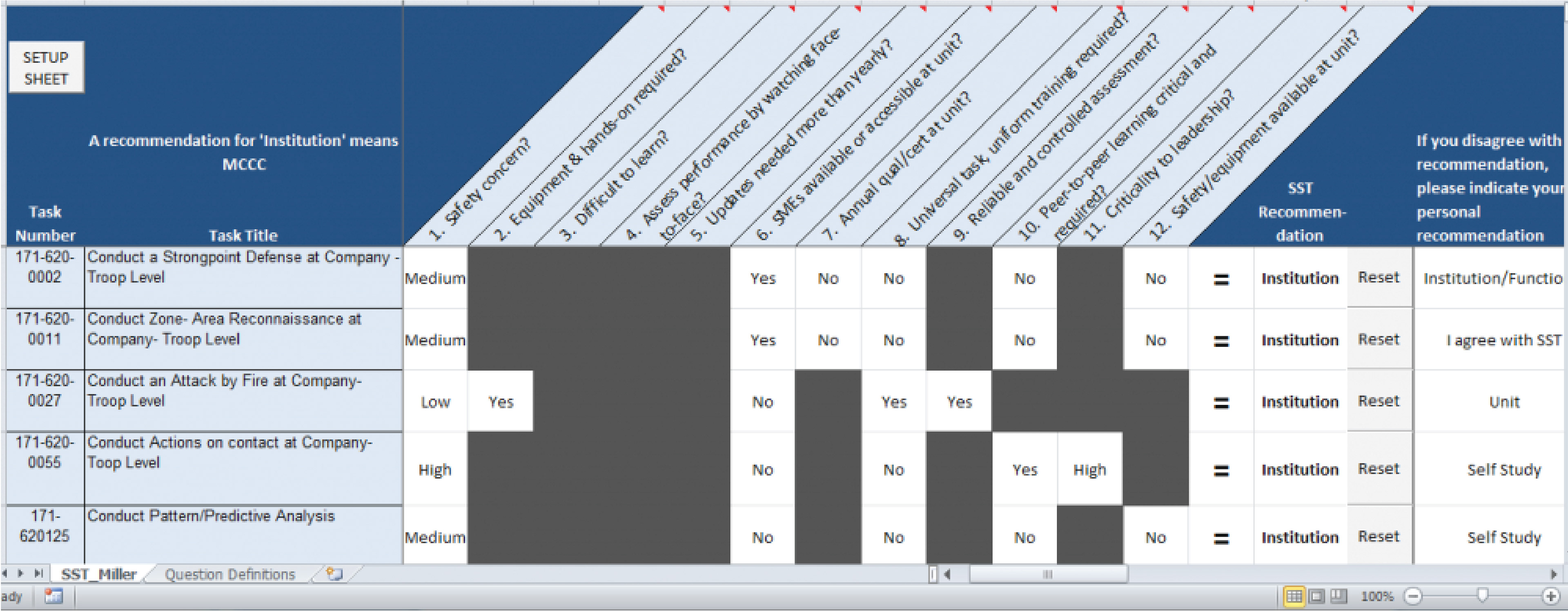 The Site Selection Tool is based on CPG’s analysis of the most critical factors used by SMEs to identify optimal training sites for individual tasks. It is intended for use by Critical Task Site Selection Boards, or CTSSBs, which review and validate each MOS’s critical task list, then recommend the site in which each task should be trained — institution, operational unit, or via self-study. CTSSBs are generally comprised of experienced and respected Soldiers who represent the MOS, however, these individuals rarely have experience recommending training sites.
